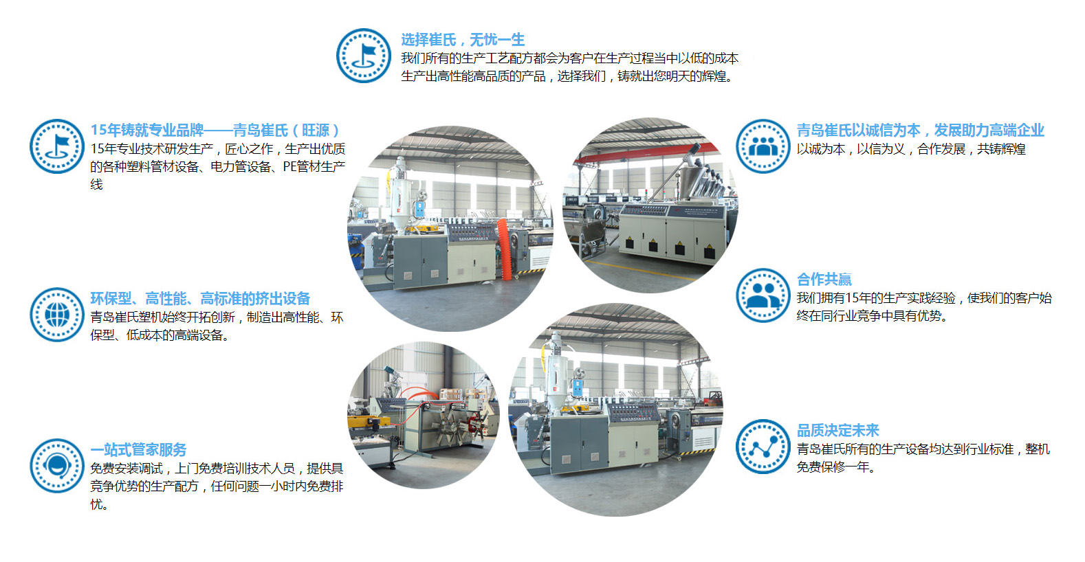 青島崔氏塑料機械:生產的預應力塑料波紋管設備、電力管設備、塑料波紋管設備、汽車線束波紋管設備、PPR、PE、PVC、PERT管材設備及其它各種管材設備、塑料型材設備、塑料蜂窩板設備, 遠銷:歐州,獨聯體,南美洲,中東,東南亞,大洋州,非洲等地的20多個國家和地區。